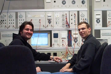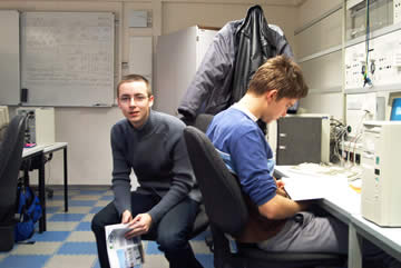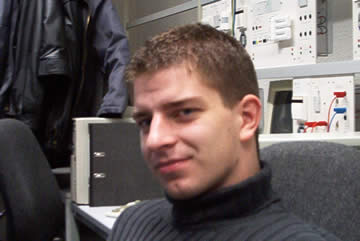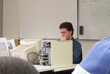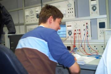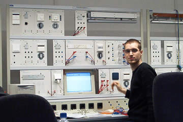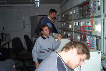 | Auch wenn es so aussieht, als wisse Flo, was er tut, der leere Bildschirm beweist das Gegenteil! Da können auch die paar angestöpselten Strippen nix dran ändern! | Das ist der Fachmann! Nicht nur Vermittlungstechnik, SPS und TK-Anlagen haben es Frank angetan, auch der EIB steht bei ihm hoch im Kurs. Und so beschloss er kurzerhand sein zukünftiges Haus so zu verkabeln! |
